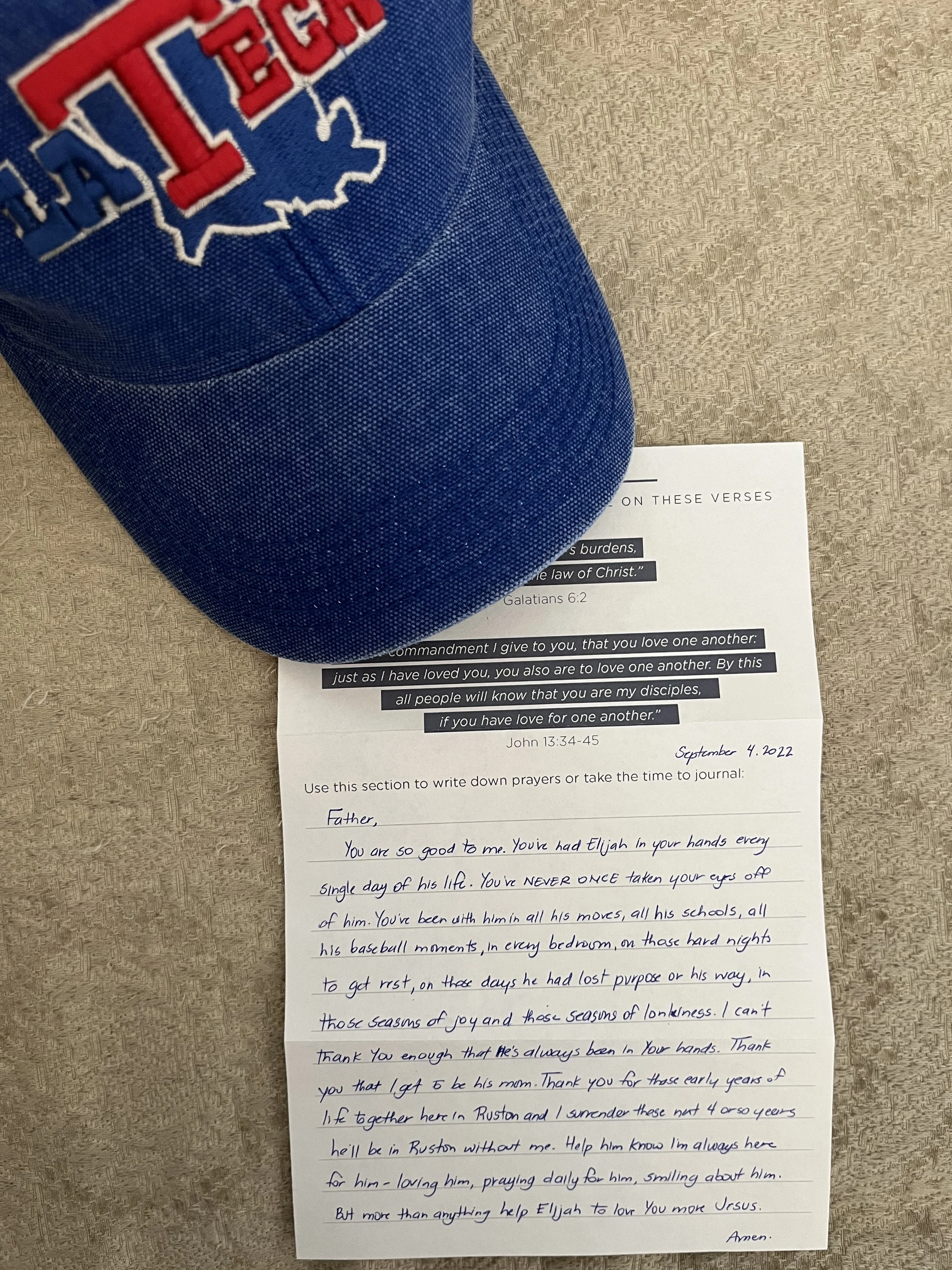 Father, You are so good to me. You’ve had Elijah in Your hands every single day of his life. You’ve NEVER ONCE taken your eyes off of him. You’ve been with him in all his moves, all his schools, all his baseball moments, in every bedroom, on those hard nights to get rest, on those days he had lost purpose or his way, in those seasons of joy and those seasons of loneliness. I can’t thank You enough that he’s always been in Your hands. Thank You that I get to be his mom. Thank you for those early years of life together here in Ruston and I surrender these next 4 or so years he’ll be in Ruston without me. Help him know I’m always here for him - loving him, praying daily for him, smiling about him. But more than anything, help Elijah to love you more, Jesus. Amen.