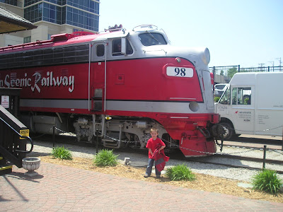 Mimi (Shauna's mom) is in town from Georgia for 10 days! We are just 30 miles north of Branson, Missouri and headed down on Monday to ride the Branson Railway. It was a 40 mile ride through the Ozarks. Everything was so green and full of life. We got to visit the different vintage cars and enjoy snacks in the dining car. Our favorite part was sitting in the observation deck as we went through a tunnel and into Arkansas. We finished the day at Branson Landing: eating ice cream, playing on the playground, riding the trolley, watching a water show, and enjoying Mexican food with daddy! What a day!