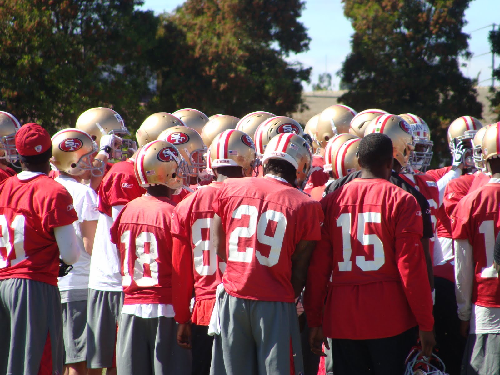 The 49ers huddle after doing some warm-up exercises.